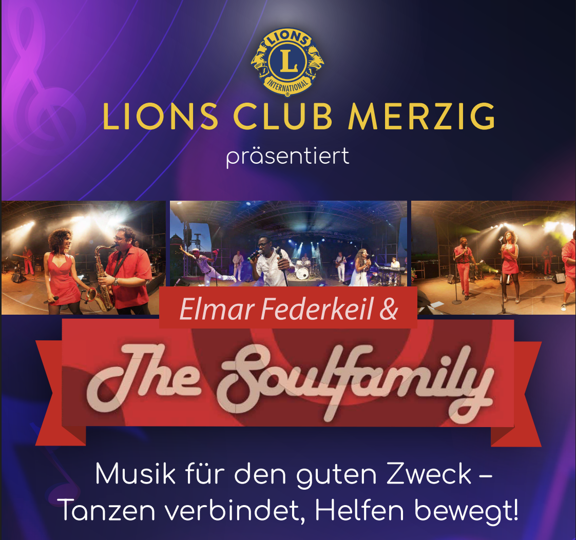 Der Lions Club Merzig lädt am Freitag, den 17. April 2026, zu einem mitreißenden Benefizkonzert in die Stadthalle Merzig ein. Auf der Bühne stehen Elmar Federkeil & The Soulfamily, die mit energiegeladenem Soul, Funk und Live-Show für beste Stimmung sorgen. Unter dem Motto „Musik für den guten Zweck – Tanzen verbindet, Helfen bewegt!“ erleben Gäste einen Abend voller Rhythmus und Emotionen – und unterstützen dabei gleichzeitig ein soziales Projekt der Region. Einlass ist ab 18:30 Uhr, Beginn um 20:00 Uhr. Tickets sind für 29 € über Ticket Regional erhältlich.